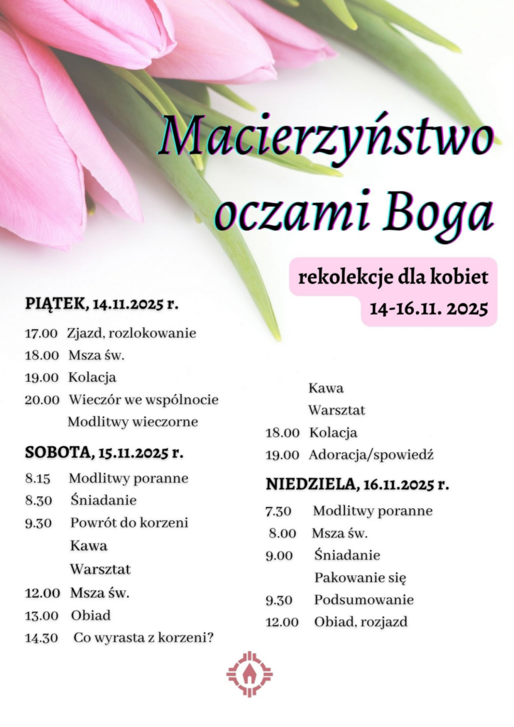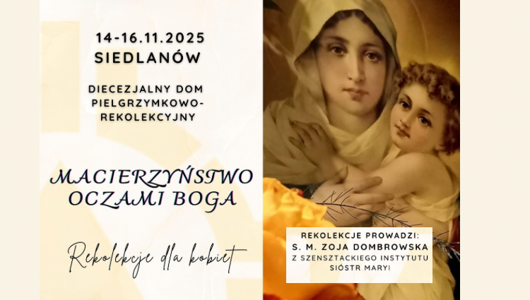 W dniach 14-16 listopada w Domu Rekolekcyjnym w Siedlanowie odbędą się rekolekcje dla kobiet, które poprowadzi s. Zoja Dombrowska. Temat rekolekcji ” Macierzyństwo oczami Boga”.